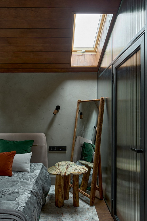 В кровле появились два мансардных окна, которые наполнили спальню естественным светом. На полу — кварцпаркет Quartz Parquet Классик Дуб Брауни 413.